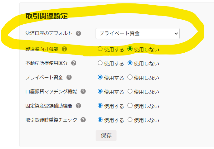 [その他設定 ▶ 事業所の詳細設定 ▶ 決済口座のデフォルト] で 「プライベート資金」を選択します。立替払い(事業主借)として記帳されるため、現金残高は動きません。 - 小口現金を運用する場合